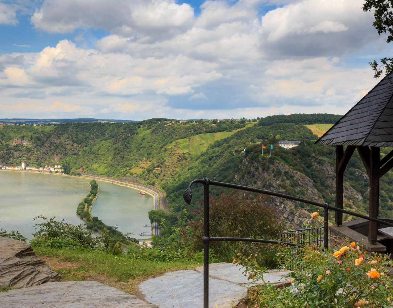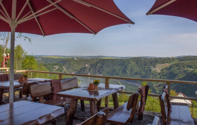 Vanaf het Urbar uitkijkpunt “Maria Ruh” kunt u aan de overkant genieten van een onvergetelijk uitzicht op de legendarische Loreley-rots, tot diep in het smalste deel van de Rijn en verder stroomafwaarts naar de kastelen Katz en Maus.